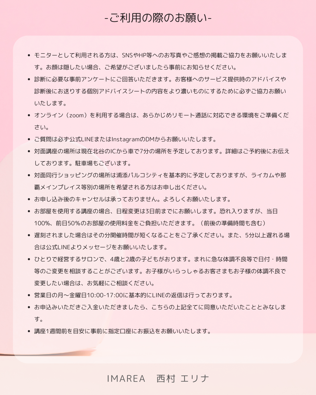 お申し込み後、お振込が確認できましたら、日程を決めた時点でテキストや講座に必要な色見本等の発注をさせていただきます。そのため、お申込み後のキャンセルは基本的に承っておりません。ご了承の上、お申し込みをお願いいたします。 対面の場合はレンタルサロンにて講座を行なっております。お部屋を使用される講座をキャンセル、または日程変更される場合。お部屋の料金を当日100%、前日50%キャンセル料金を頂戴しております。(前後の準備時間を含む)無料キャンセル受付は3日前までですのでよろしくお願いいたします。オンライン受講の場合はキャンセル料金は発生しません。 |